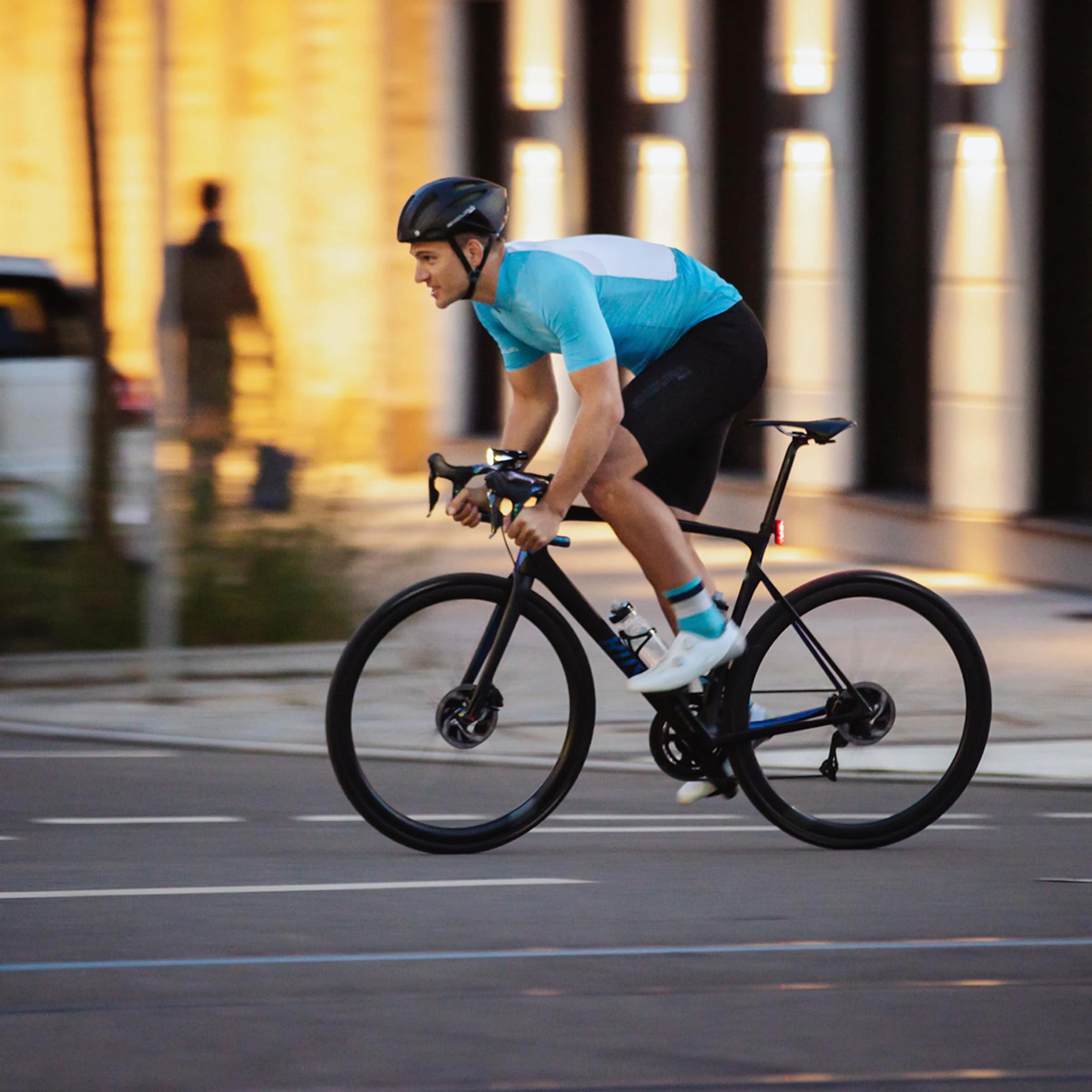 The connected lights offer 4 brightness levels so that you can either adjust them depending on ambient light, visibility or required battery life or set them to automatic mode for automatic adjustments to the ambient light. The connected lights have a battery life of up to 7 hours. Battery charge indicator LEDs on top of the light give you the current battery charge and you can also read the selected ride mode from the front and rear light. This is also where you can switch between the different modes. A homogeneous light beam with a range of 110 metres ensures you can perfectly see the road ahead – even when cycling fast or on unlit roads. A Light Guide on the sides of the LED front light and the powerful BLAZE LINK rear light offers all-round visibility on evening training rides. Three bright LED lights inside the BLAZE LINK help other road users see when you’re braking. This is also a very useful feature when riding in a group.