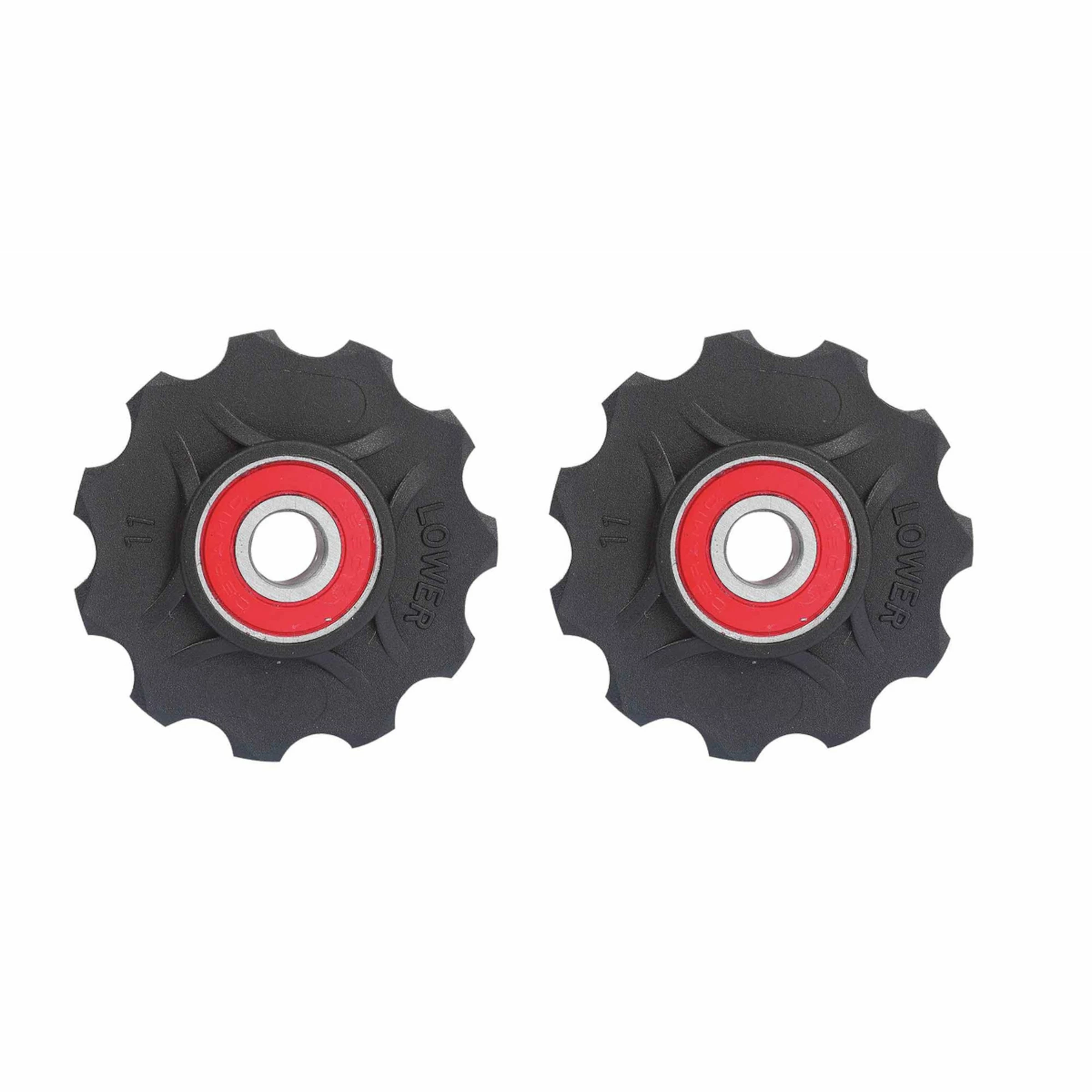 Smooth-running plastic derailleur wheels with ceramic bearings and high durability.