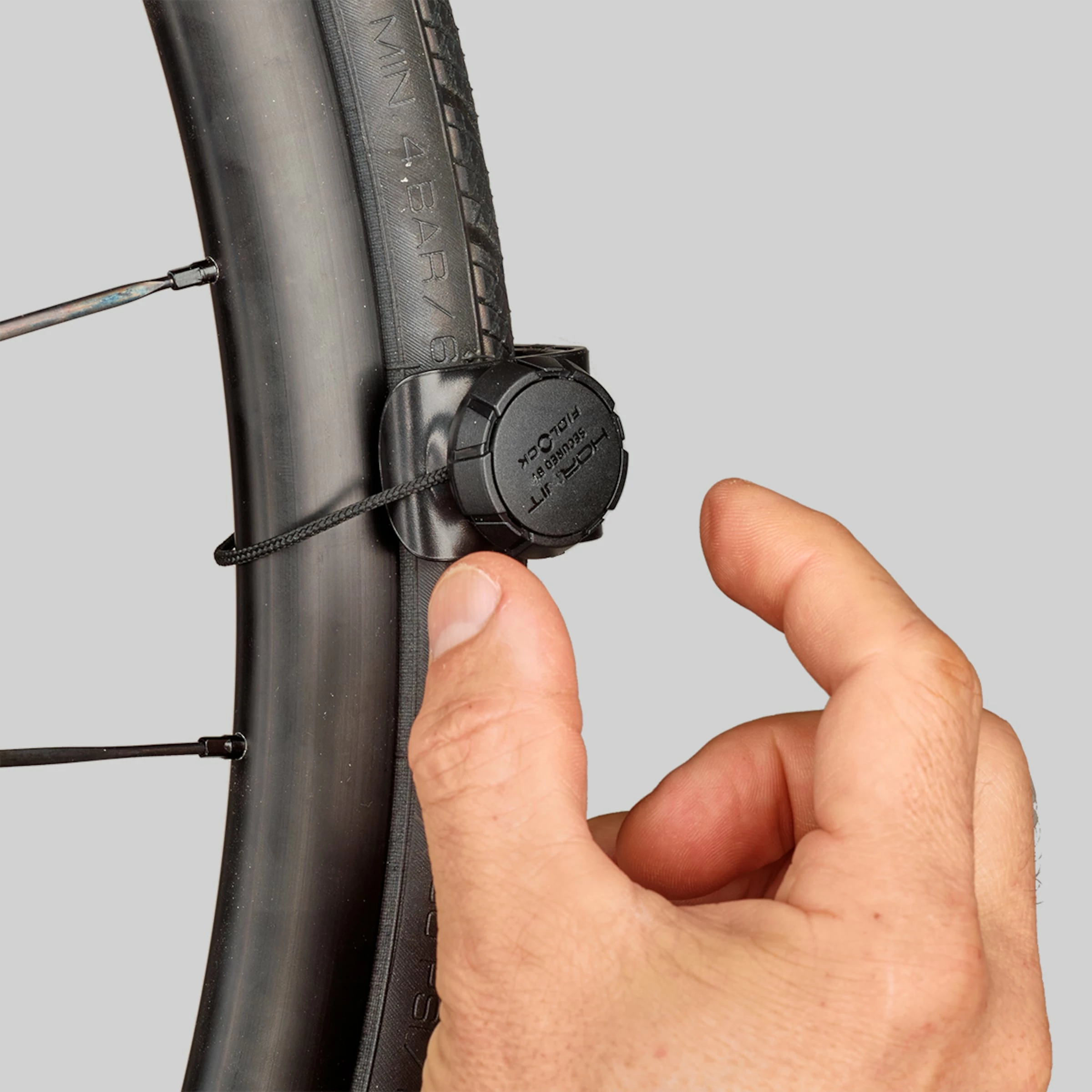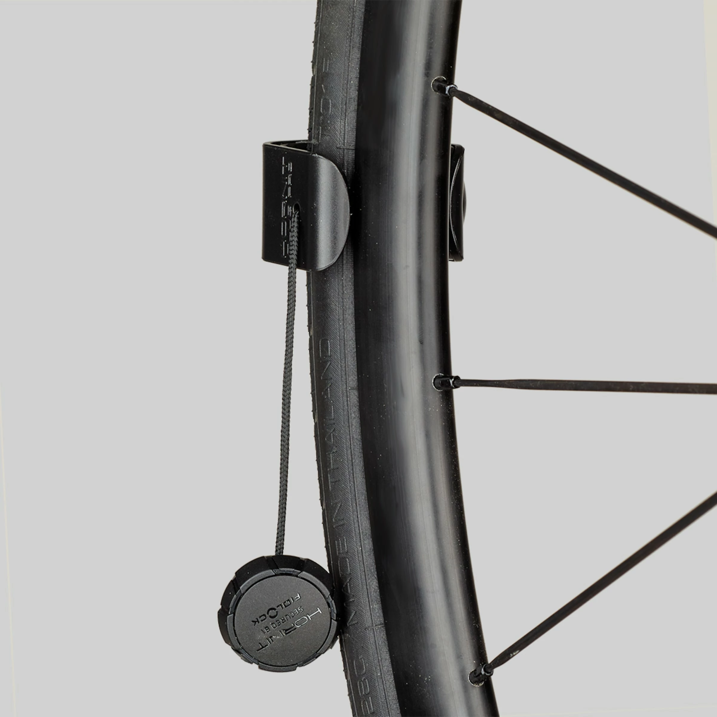The CLUG PRO ROADIE is small, practical and can be quickly and discretely screwed to the wall. By simply flipping the holder, the magnetic WINCH rotary knob can be on either the left or right side, as desired, in order to ensure that the bike can be quickly released or secured with one hand. If when clamping the CLUG PRO grabs the tyre without making contact with the rim, you can put the cord lock around the rim and the clever FIDLOCK mechanism will automatically dock onto the holder. The loop is long enough for 9 cm high aero rims and can be easily adjusted through shortening it. The interlocking rotary knob winds up the tensioning cord according using the rope winch principle. This secures the wheel in the holder. When the magnetic lock is opened, the cord returns to its full length, ready for the next adjustment.